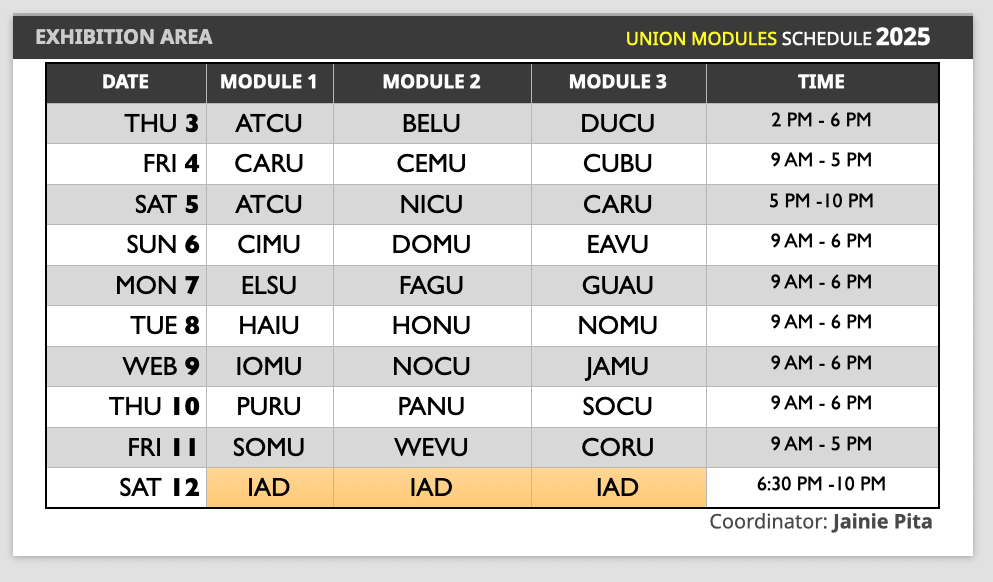 - Each Union will have up to 40 minutes available in the mini auditorium on the same day as their exhibition, to share an engaging program that includes general information about their territory (data, testimonies, interviews, videos, etc.)